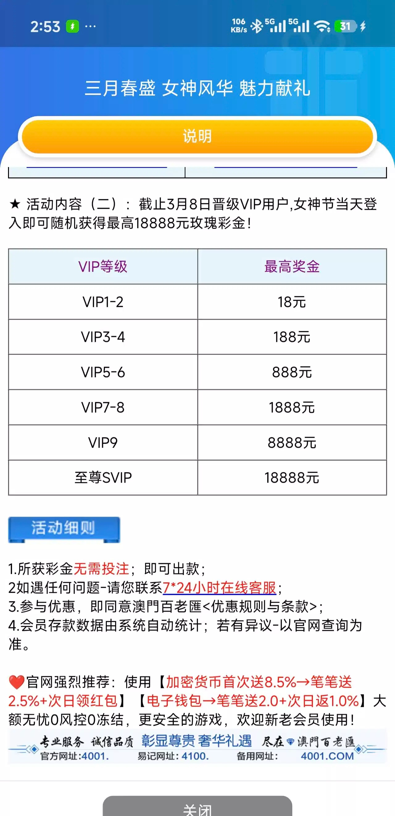 3.8号中午12点登录一下就有 有等级的记得登录一下 我vip3估计保底18 客服说的是随机赠送最高彩金如图 网址4001.com