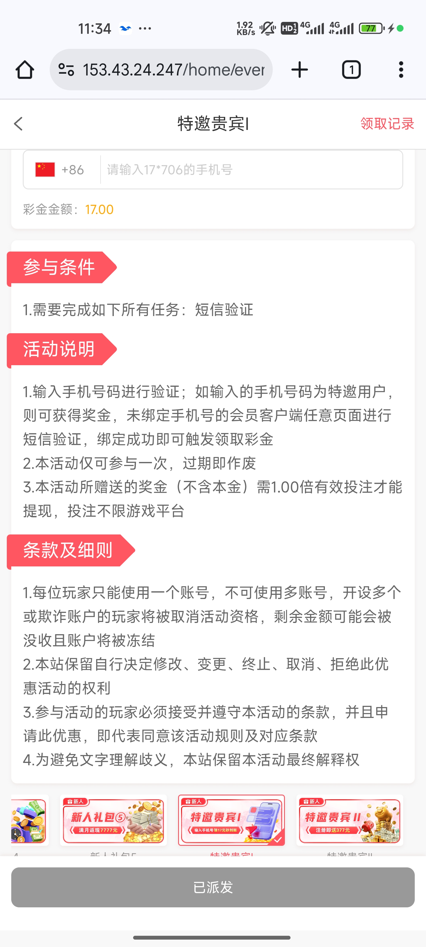 验证手机号领17彩金,自己测试,我没打出来,但昨晚看到好几个老哥都打出来了,被黑自负,请勿充值