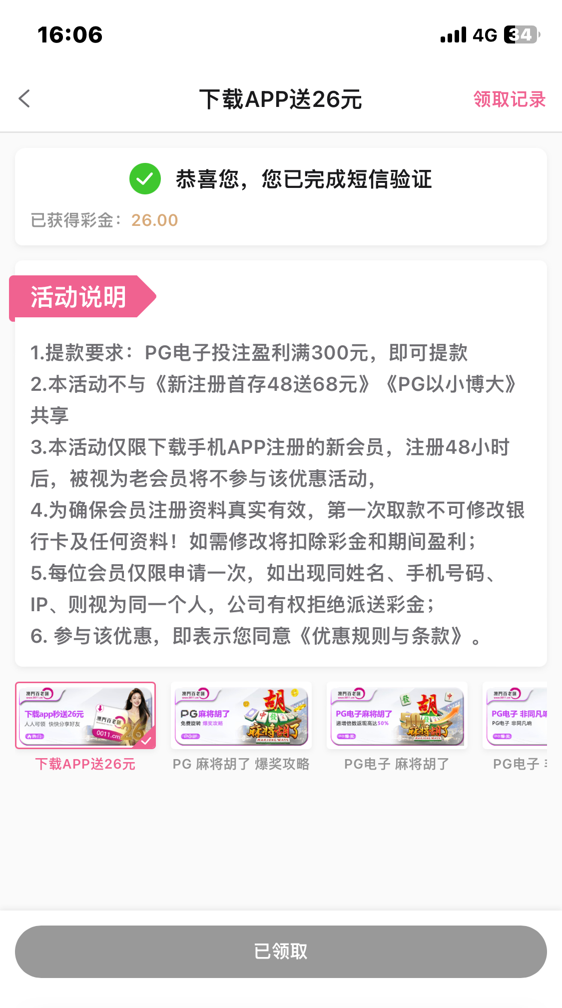1.提款要求:PG电子投注盈利满300元,即可提款2.本活动不与《新注册首存48送68元》《PG以小博大》共享3.本活动仅限下载手机APP注册的新会员,注册48小时后,被视为老会员将不参与该优惠活动,4.为确保会员注册资料真实有效,第一次取款不可修改银行卡及任何资料!如需修改将扣除彩金和期间盈利;5.每位会员仅限申请一次,如出现同姓名、手机号码、IP、则视为同一个人,公司有权拒绝派送彩金;6. 参与该优惠,即表示您同意《优惠规则与条款》。